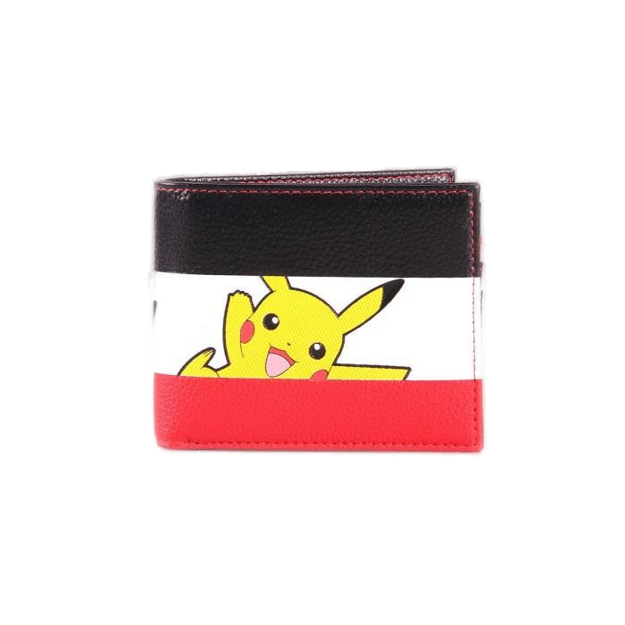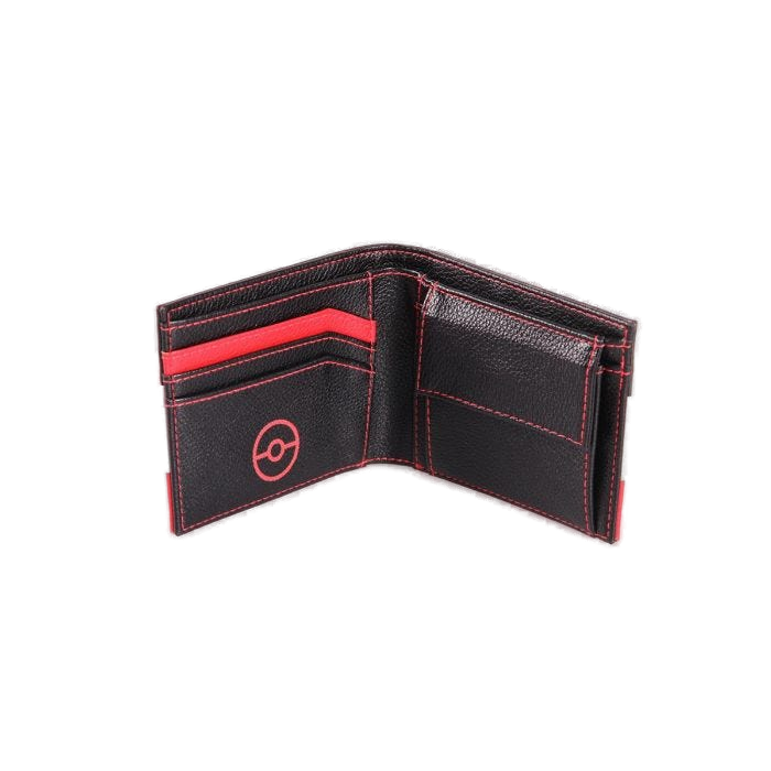 Pokémon - Pikachu PU bifold wallet with screen print and debossed print for outside panel ,red lining and Poke ball debossed print inside with cardslots, clear PVC window, and coin pocket with hidden snapbutton