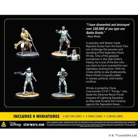 A legendary Jedi Master crashes the party in this pack for Star Wars: Shatterpoint! Few can challenge the prowess of Mace Windu and this pack brings this legendary swordsman to Star Wars: Shatterpoint along with Clone Commander CT-411 "Ponds" and two ARF Troopers. Players can use these characters together as a powerful squad or have them join other characters in their own custom teams. No matter what they choose, players will also find all the Stat, Order, and Stance cards they need to add these characters to any Star Wars: Shatterpoint squad.