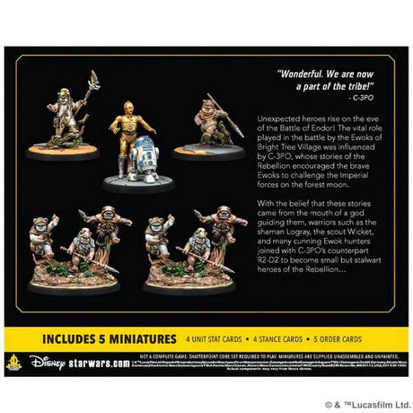 Unexpected heroes rise to join the battles of Star Wars™: Shatterpoint in this new pack! The Ewoks of Bright Tree Village played a vital role in the Rebellion's victory in the battle of Endor and this pack brings the Ewok shaman Logray into the game as a Primary Unit. He is joined by Wicket as a Secondary Unit and two Ewok Trappers wielding spears as a Supporting Unit. Rounding out the pack are R2-D2 and C-3PO, who join together to form another Secondary Unit option. In addition to miniatures of these characters, this pack also includes all the Stat, Order, and Stance cards players need to add these characters to their squads.