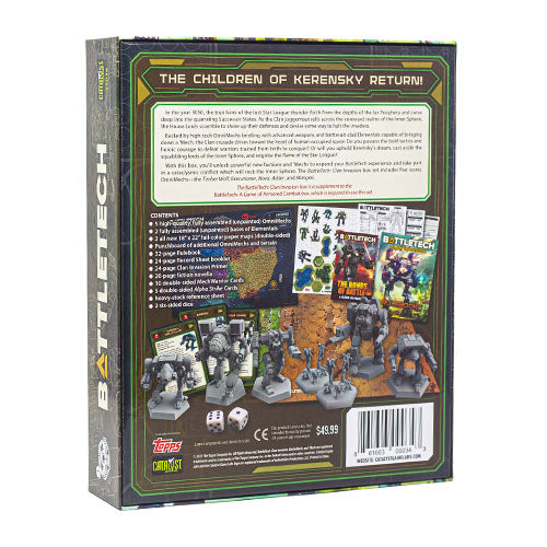 ARMOR UP!In 3050, the true heirs of the lost Star League thunder forth from the depths of the far Periphery and carve deep into the quarreling Successor States. As the Clan juggernaut rolls across the coreward realms of the Inner Sphere, the House Lords scramble to shore up their defenses and devise some way to halt the invaders.The Clan spear is aimed at the heart of human-occupied space. Do you possess the bold tactics and heroic courage to defeat warriors trained from birth to conquer? Or will you uphold Kerensky's dream to cast aside the squabbling lords of the Inner Sphere and reignite the flame of the Star League?BattleTech is the world's greatest armored combat game, and now you can add the Clans! Inside this box you'll discover epic clashes, dynamic characters, and a myriad of gaming experiences for any type of player: miniatures to RPG play, hobby painting to fiction, and beyond.Clan Invasion includes everything you need to add Clans to your table.Battletech: Clan Invasion include the following items:- Battletech: Clan Invasion rulebook- Battletech: Clan Invasion primer- A 24 page Book of record sheets- Battletech: Inner Sphere 3025/3052 double sided map- A tables quick-reference card- A sheet of cardboard punch outs including Mechs & Terrain Hexes- The Bonds of Battle Novella- Hilltops #1 mapsheet- Rolling Hills #2 mapsheet- 2 Six-sided dice- A deck of pilot cards- 7 High-quality miniatures (Grendel, Timberwolf, Executioner, Nove, Adder, 2 bases of Clan Elementals)Player Count: 1-5Time: 60-240 MinutesAge: 8+