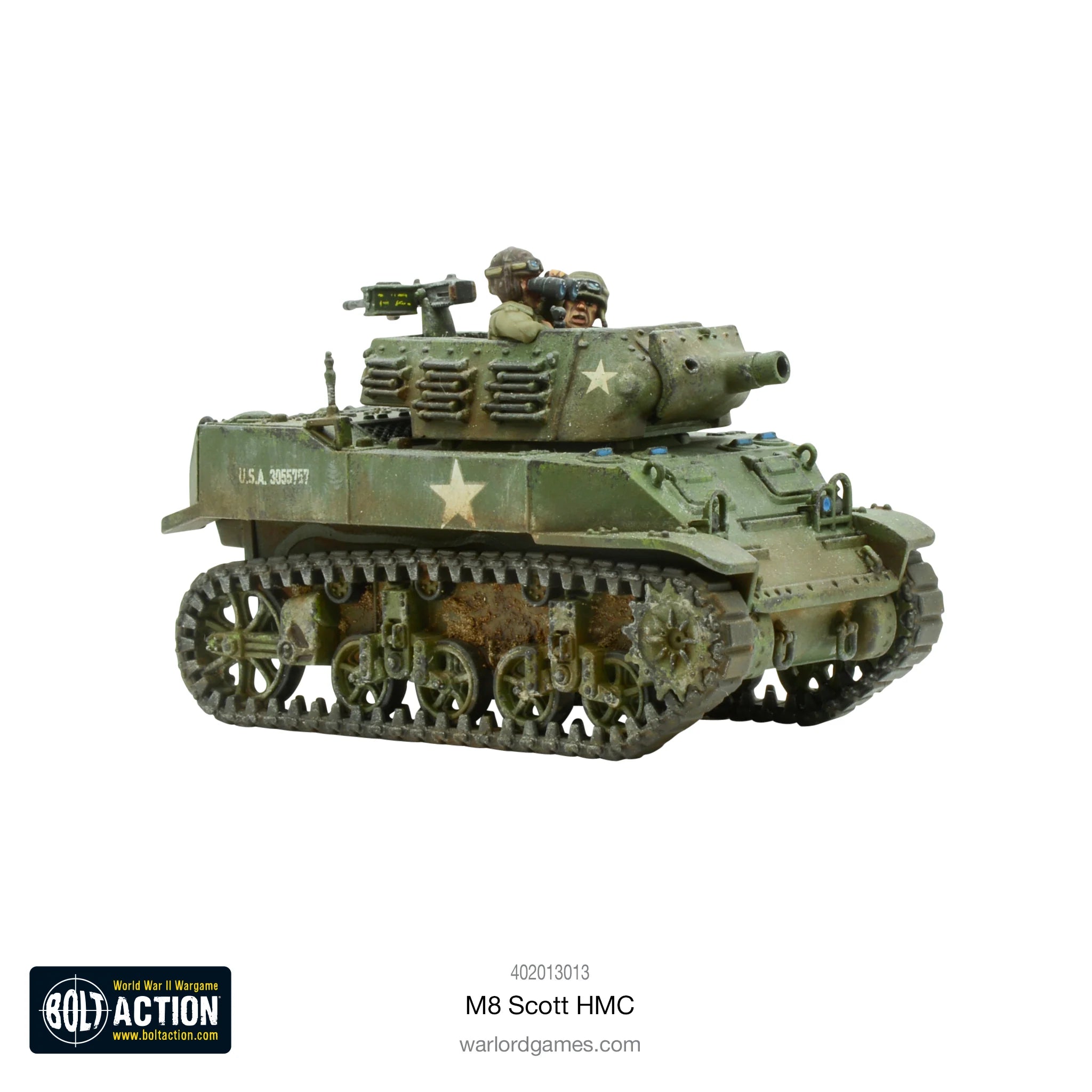 Based on the ubiquitous M5 Stuart light tank hull, the M8 75mm Howitzer Motor Carriage (HMC) provided much needed mobile artillery support to US assault forces. The M8 replaced the M5 Stuart turret with a more spacious open-topped turret to house a short-barrelled M2 75mm howitzer, with a pintle-mounted .50 Cal heavy machine gun to provide additional defensive firepower. It saw extensive US Army and USMC service in the Pacific Theatre, the Italian campaign, and in North West Europe, where it was also used by Free French forces.