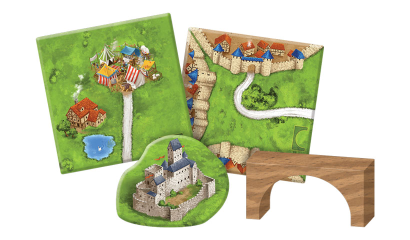 The eighth expansion for Carcassonne, Brücken, Burgen und Basare (English: Bridges, Castles & Bazaars) allows players three new options while playing: