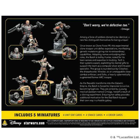 Clone Force 99 joins Star Wars™: Shatterpoint in this new Squad Pack! Commonly known as the Bad Batch, the characters in this pack give players a variety of new squad building options, beginning with Clone Sergeant Hunter as a Primary Unit in both the Clone Wars and Galactic Civil War eras. Joining him as dual era units are Wrecker and Omega as a new Secondary Unit option and Echo and Tech as a Supporting Unit. Rounding out the pack is the sniper Crosshair who enters the game as a Clone Wars-era Secondary Unit.