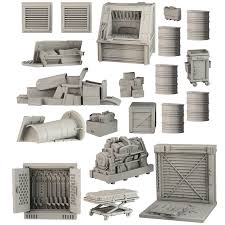 Warehouses are ideal sources of shelter and supplies after the world has ended. They can also play host to anything from clandestine corporate conspiracies to illegal arms trade and mafia deals. This set includes a wide range of scenery to populate these grimy locales, even including a weapons locker and a furnace.
